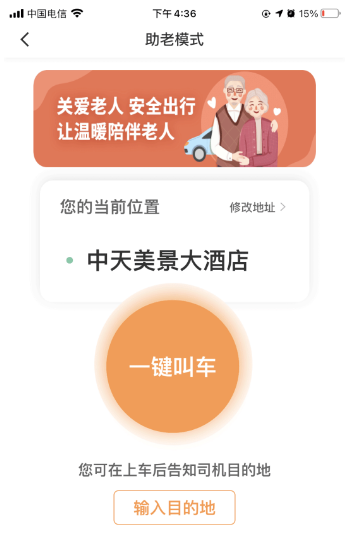 打開萬(wàn)順叫車APP、小程序,醒目的助老模式按鈕,按下一鍵叫車大按鈕就能呼叫萬(wàn)順叫車,無(wú)需輸入目的地,簡(jiǎn)化繁瑣叫車流程。