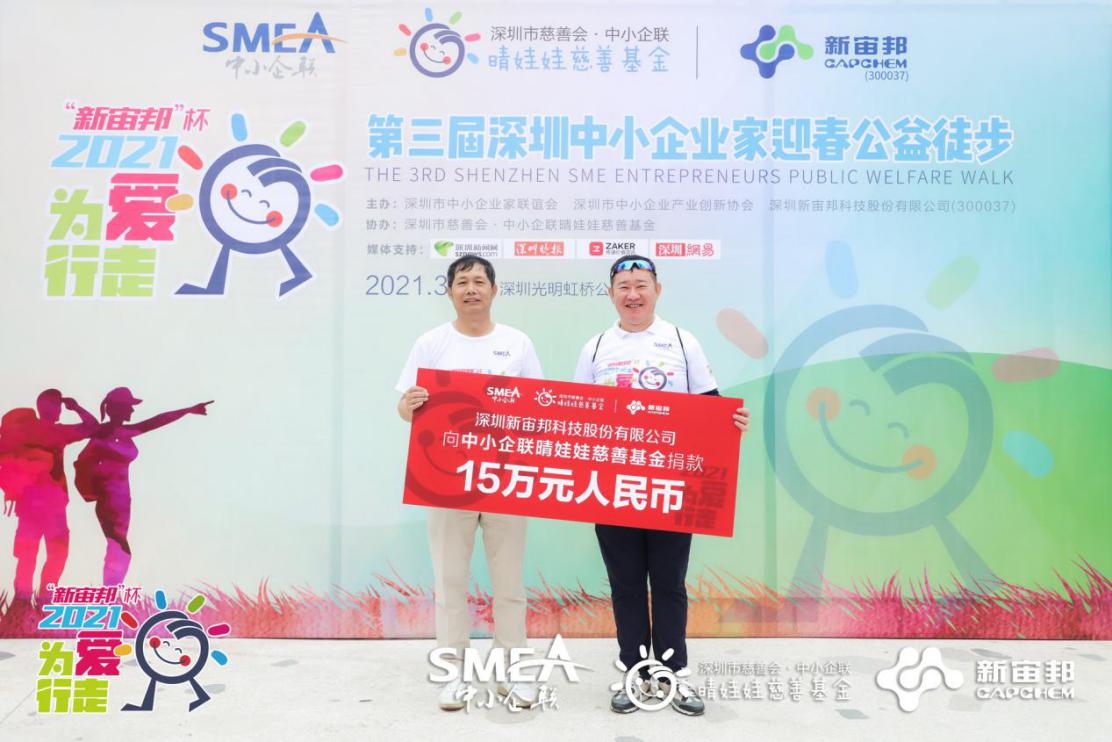 第三屆“為愛行走”活動的愛心冠名企業(yè)-中小企聯(lián)副會長、深圳新宙邦科技股份有限公司董事長覃九三向中小企聯(lián)晴娃娃慈善基金捐款15萬元人民幣。