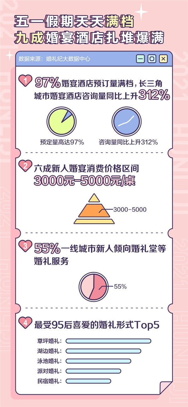 婚禮紀(jì)五一結(jié)婚數(shù)據(jù)顯示,五一假期,酒店婚宴預(yù)訂火爆,97%婚宴酒店預(yù)訂量滿檔。以上海為中心的長(zhǎng)三角城市婚宴酒店咨詢量同比上升312%。上海的婚宴消費(fèi)顯得有點(diǎn)壕,價(jià)格集中在6000元-8000元/桌,超過了全國(guó)六成新人婚宴消費(fèi)心動(dòng)價(jià)格區(qū)間3000元-5000元/桌。