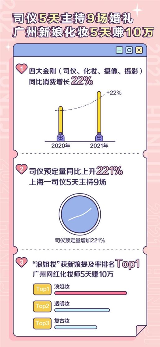 “快要忙瘋了,五一5天辦了150多場(chǎng)婚禮,第一天就有60場(chǎng),去年這時(shí)候婚禮只有個(gè)位數(shù),今年我們員工都加班加點(diǎn)連夜趕工搭建場(chǎng)地?!被槎Y紀(jì)商家Sunny喜鋪婚禮副總趙佳佳在接受采訪的時(shí)候表示,不僅商家忙,新人也非常忙,Z世代的新人都習(xí)慣于通過線上咨詢、直播下單等互聯(lián)網(wǎng)形式進(jìn)行婚禮消費(fèi),省去了線下奔波的時(shí)間。