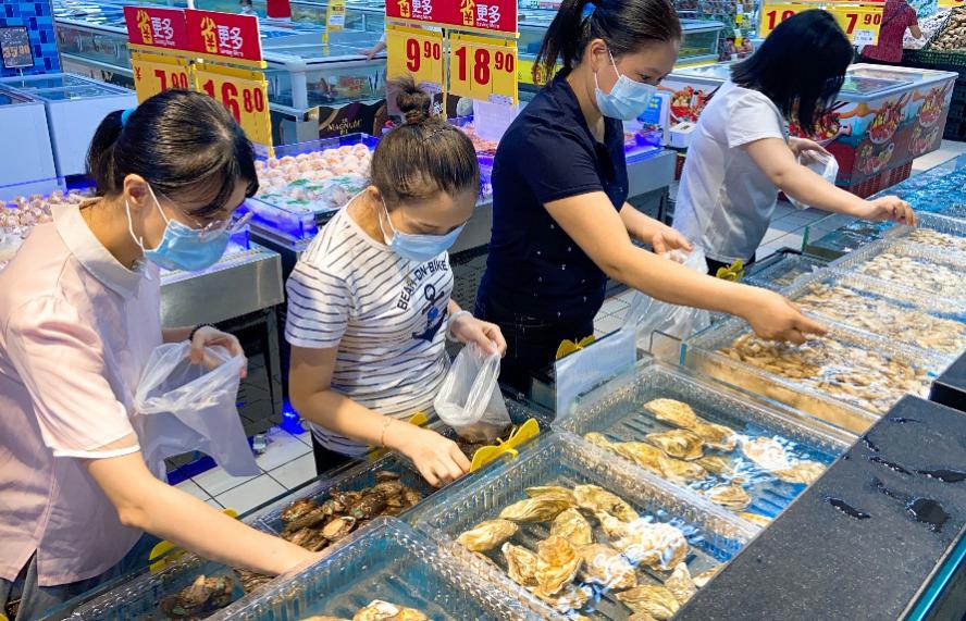 今日早晨,在家樂福深圳紅寶店,來自福建寧德、山東青島、浙江舟山、廣西北海、廣東珠海等地的鮮活生蠔、大閘蟹、基圍蝦、珍寶蟹、皮皮蝦、多寶魚等各類國產(chǎn)鮮活水產(chǎn)和來自俄羅斯的帝王蟹,英國的面包蟹,美國的珍寶蟹等各類進(jìn)口鮮活海鮮呈現(xiàn)在消費(fèi)者面前,讓早市搶購的顧客躍躍欲試。
