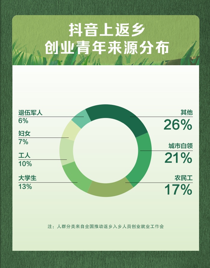 6月22日,抖音發(fā)布首份三農數(shù)據(jù)報告(以下簡稱“報告” )。過去一年,抖音農村視頻總獲贊量129億,農村視頻創(chuàng)作者收入同比增長15倍。抖音三農創(chuàng)作者中,返鄉(xiāng)創(chuàng)業(yè)青年占比54%,城市白領返鄉(xiāng)創(chuàng)業(yè)比例最高,其次為農民工。報告還從三農創(chuàng)作者來源最多的省份縣域、最受歡迎的三農視頻內容等多角度解析目前抖音三農內容生態(tài)。