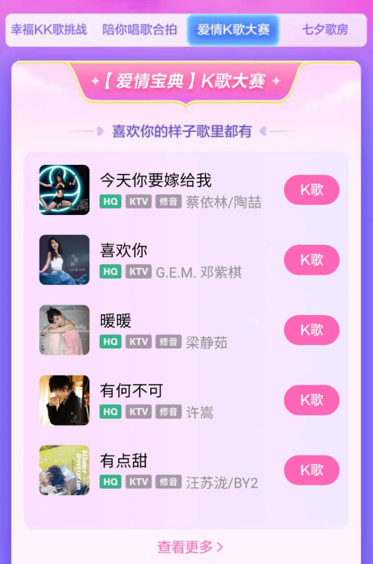 此次活動(dòng)的主題曲《幸福KK歌》改編自著名歌謠《幸福拍手歌》,喜歡手勢(shì)舞蹈的朋友可以嘗試“幸福KK歌”親密挑戰(zhàn),只要按照示例視頻演唱歌曲并完成5個(gè)指定動(dòng)作,發(fā)布視頻即挑戰(zhàn)成功;而對(duì)于喜歡對(duì)唱的人,可以選擇“陪你唱歌”心動(dòng)合拍大賽,在合唱模板中,pick讓你心動(dòng)的小哥哥/小姐姐,發(fā)布與TA的合唱即算挑戰(zhàn)成功;“情歌王”們則可以來(lái)「愛情寶典」K歌大賽一展歌喉,演唱官方七夕主題歌單中的歌曲,人氣排名前10的優(yōu)秀用戶也能獲得獎(jiǎng)勵(lì);還有七夕歌房任務(wù)限時(shí)開啟,完成七夕歌單演唱、“一起聽”情歌、七夕“話題熱聊”任務(wù),即可獲得“七夕大聲愛”“加油鴨”等道具禮物。