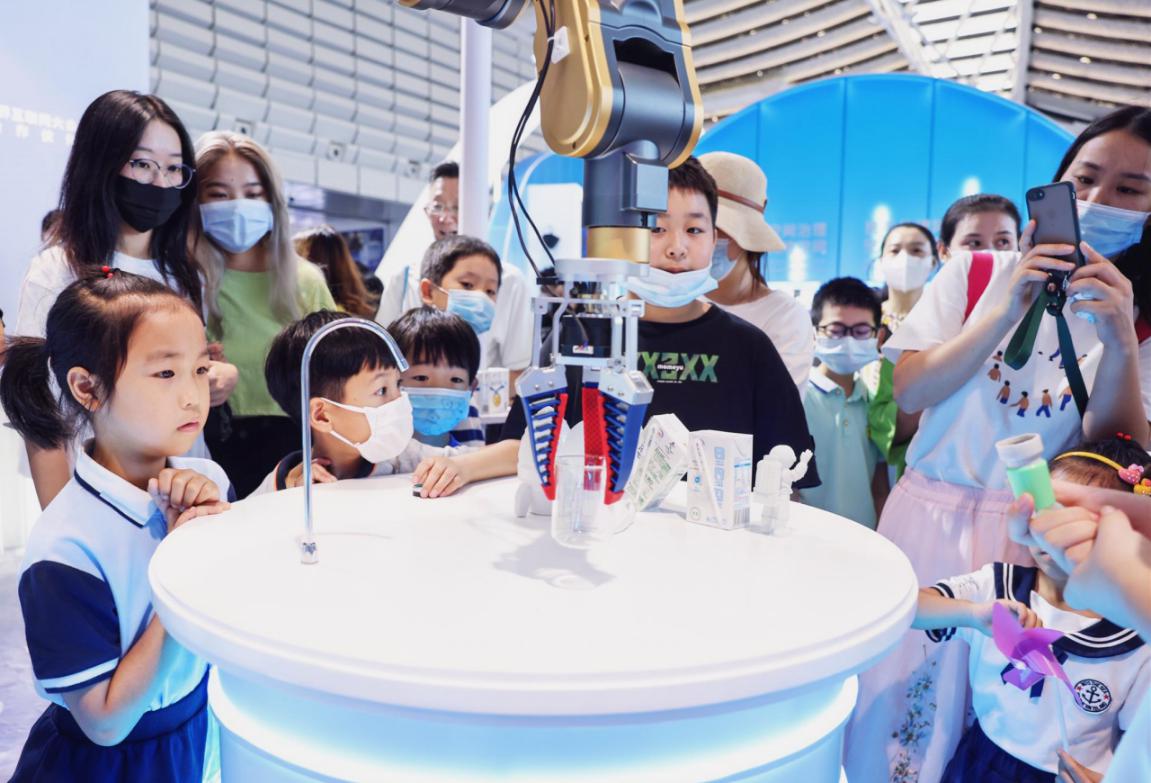 這牛奶和其他的不太一樣,很香濃?!半x心精萃‘白科技’開(kāi)啟臻濃新紀(jì)元”展臺(tái)一直就是博覽會(huì)現(xiàn)場(chǎng)的“人氣王”,這里以宇宙探索為主題,科幻感十足,火箭發(fā)動(dòng)機(jī)噴出淡淡煙霧,三臺(tái)智能機(jī)械臂不停忙碌,人們排起長(zhǎng)隊(duì),品嘗由“離心精萃科技”現(xiàn)場(chǎng)調(diào)制的伊利臻濃牛奶。在這里,吸引觀眾的不僅是美味的伊利牛奶,也有滿滿的數(shù)字科技。