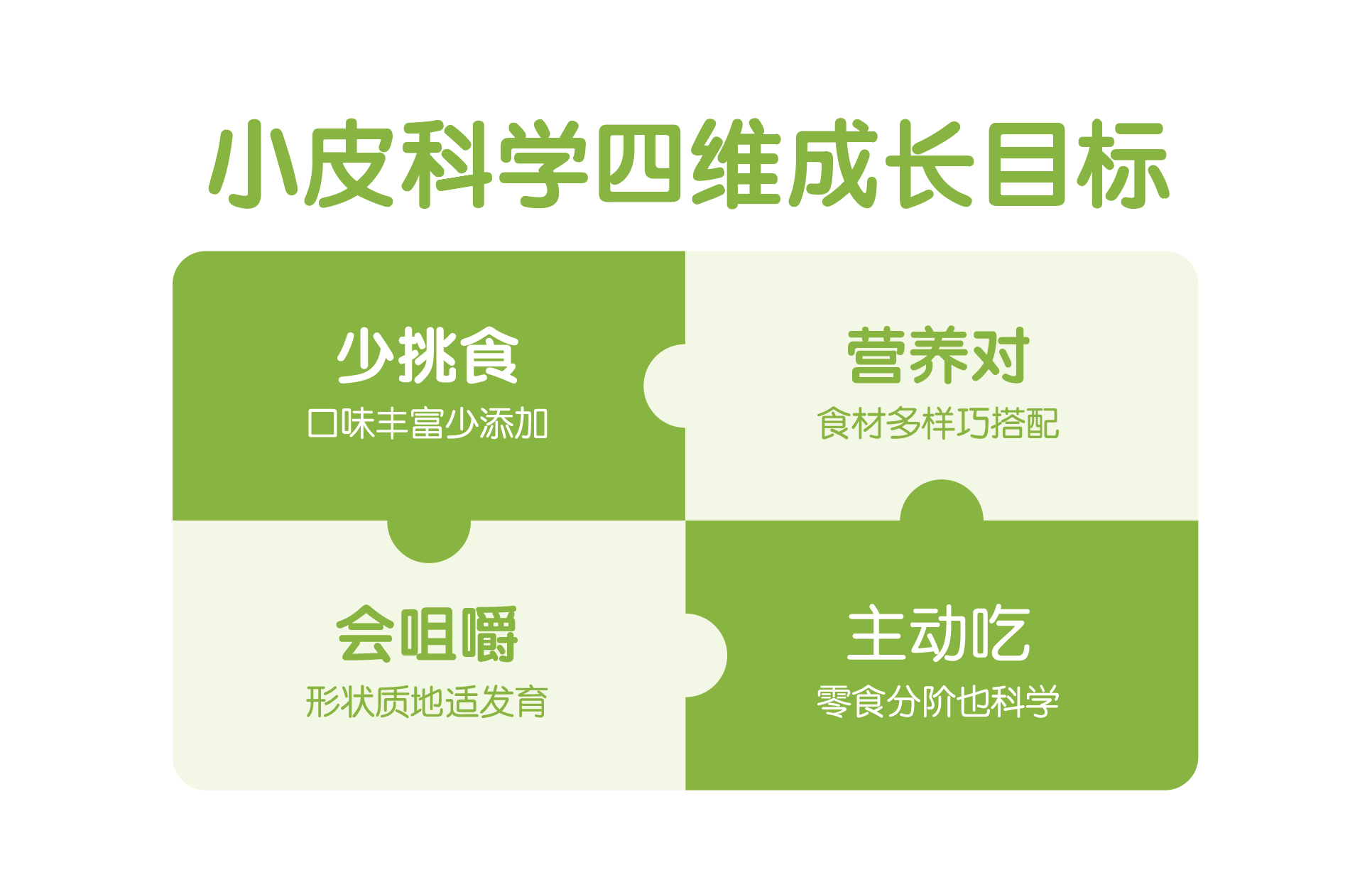 2017年,我國將“生命早期1000天營養(yǎng)健康行動”列為國民營養(yǎng)計劃重大行動之一,但相比孕產(chǎn)期與新生兒階段已覆蓋完善的營養(yǎng)指導(dǎo)來說,輔食階段的科學(xué)喂養(yǎng)關(guān)注程度與認知教育還有待提升。在此背景下,小皮基于嚴謹?shù)目茖W(xué)研究提出《6-36月齡嬰幼兒四維科學(xué)喂養(yǎng)方案》,并通過中國食品科學(xué)技術(shù)學(xué)會權(quán)威論證,旨在幫助寶寶建立起“少挑食、營養(yǎng)對、會咀嚼、主動吃”的健康飲食習(xí)慣。