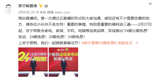 2月24日晚,蘇寧易購召開線上發(fā)布會,宣布27日起,將聯(lián)合家電、家裝、3C等品類品牌,全場景推出“購家電家裝手機,享24期分期免息”活動,讓消費者零負擔擁有喜歡的好物。
