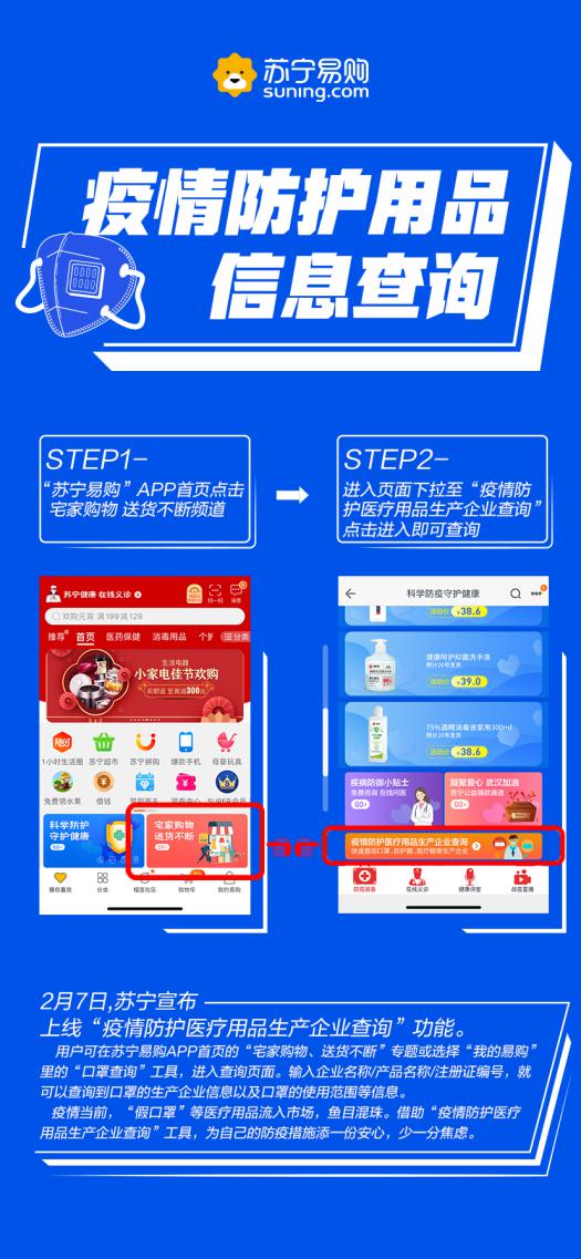 用戶可在蘇寧易購APP首頁的“宅家購物、送貨不斷”專題或選擇“我的易購”里的“口罩查詢”工具,進(jìn)入查詢頁面。輸入企業(yè)名稱/產(chǎn)品名稱/注冊(cè)證編號(hào),就可以查詢到口罩的生產(chǎn)企業(yè)信息以及口罩的使用范圍等信息。