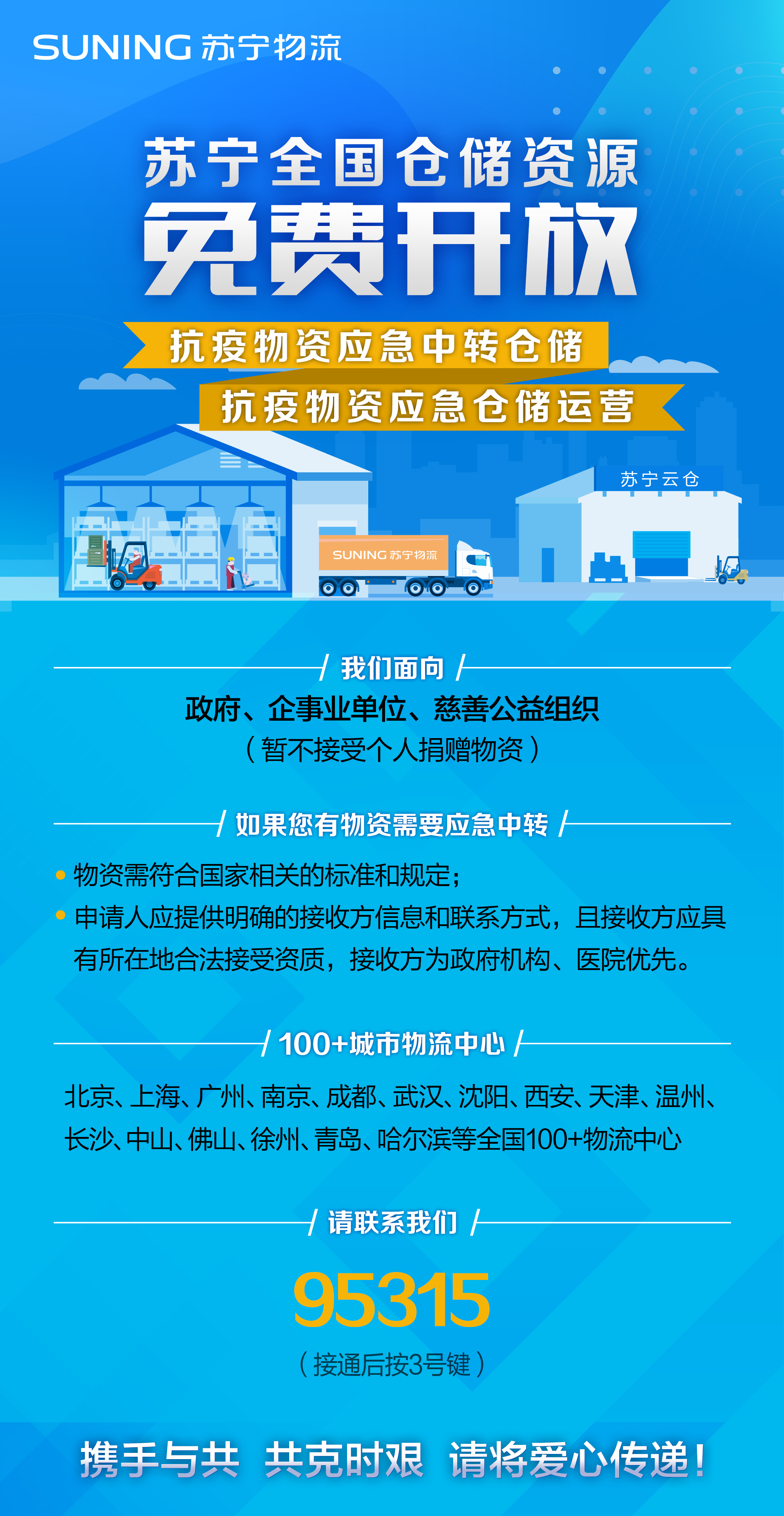2月10日,蘇寧物流宣布,將面向政府、企事業(yè)單位、慈善公益組織免費(fèi)開放全國倉儲(chǔ)資源,為抗疫物資提供應(yīng)急中轉(zhuǎn)倉儲(chǔ)和應(yīng)急倉儲(chǔ)運(yùn)營服務(wù)。