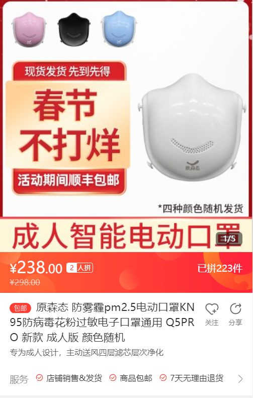蘇寧拼購(gòu)積極聯(lián)系“拼工廠”復(fù)工,尋找源頭好貨?!霸瓚B(tài)”KN95電動(dòng)口罩區(qū)別于市面上普通口罩,由博士專家團(tuán)隊(duì)打造,產(chǎn)品質(zhì)量符合歐盟、美國(guó)等出口國(guó)高標(biāo)準(zhǔn)。