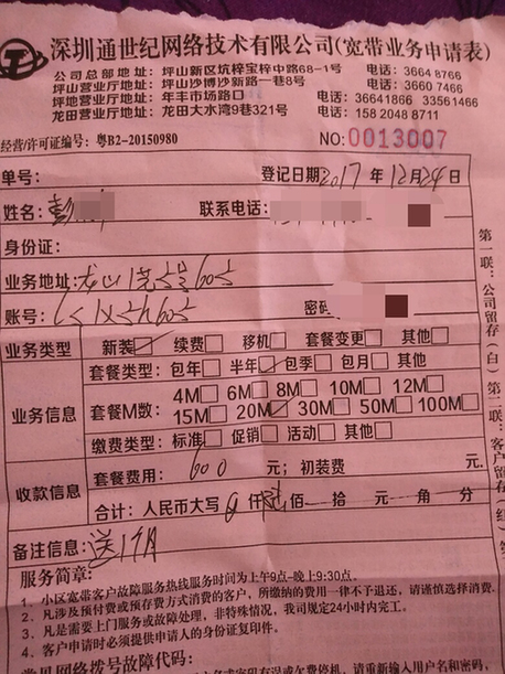 網友提供的寬帶業(yè)務申請表