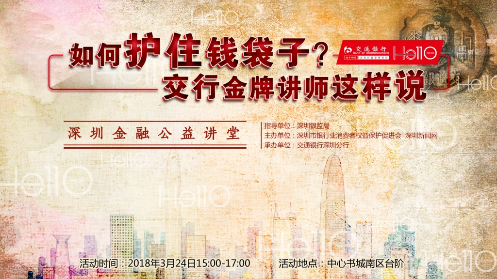 在深圳銀監(jiān)局指導(dǎo)下,由深圳新聞網(wǎng)和深圳市銀行業(yè)消費(fèi)者權(quán)益保護(hù)促進(jìn)會共同主辦,交通銀行深圳分行承辦的2018年“深圳金融公益講座”系列活動將在3月24日14:30,于中心書城南區(qū)大臺階拉開帷幕。