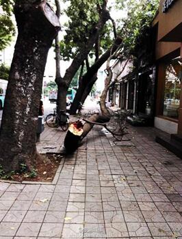 然而行道樹的不當(dāng)種植與生長(zhǎng)也會(huì)帶來許多危害。行道樹傾斜生長(zhǎng)極易造成樹木倒伏,倒伏后造成倒壓占道的同時(shí)也存在巨大的安全隱患。且行道樹龐大的樹根也會(huì)存在破壞人行道及盲道的現(xiàn)象,造成路面不平,部分傾倒的樹木還易引發(fā)斷電和漏電等問題,給市民生活帶來不便。