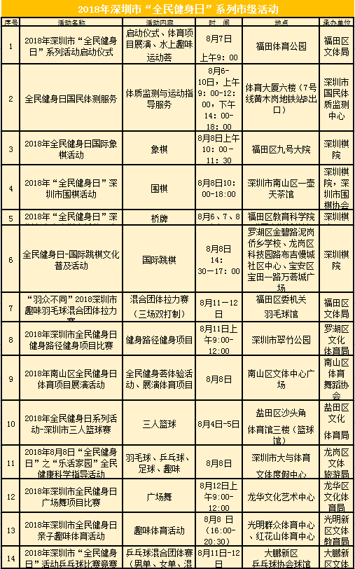 ????為方便更多群眾加入全民健身隊(duì)列,在今年的“全民健身日”,深圳市文體旅游局將在8月4日至12日,在全市開展全民組織開展,其中市級(jí)活動(dòng)14項(xiàng),各區(qū)也將因地制宜對(duì)活動(dòng)進(jìn)行時(shí)空拓展。下表為14大市級(jí)活動(dòng)詳情。