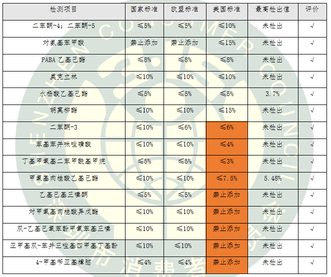 防曬化妝品在美國按非處方藥(OTC)管理,新的防曬劑當(dāng)作新藥品來批準(zhǔn),審評要求非常嚴(yán)格。本次比較試驗測試的15類化學(xué)防曬劑按照國標(biāo)、歐標(biāo)和美標(biāo)中最嚴(yán)格的標(biāo)準(zhǔn)進(jìn)行評價。我國允許使用的5類化學(xué)防曬劑在美國被禁止使用,還有4類化學(xué)防曬劑在美國的限量要求更加嚴(yán)格。