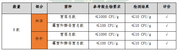 檢測結(jié)果顯示:8款氣墊粉底的粉撲和料體的菌落總數(shù)、霉菌和酵母菌總數(shù)檢出量均低于10 CFU/g,遠(yuǎn)低于產(chǎn)品微生物的標(biāo)準(zhǔn)要求限值,屬于安全范圍,消費者無需過度擔(dān)心。