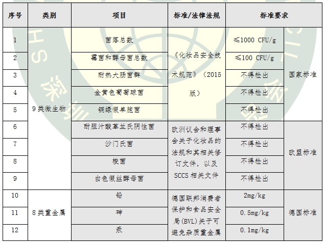 本次比較試驗檢測項目廣泛征求了企業(yè)、業(yè)內(nèi)專家和第三方檢測機(jī)構(gòu)的意見,不僅依據(jù)了現(xiàn)行國家標(biāo)準(zhǔn),而且在國標(biāo)基礎(chǔ)上結(jié)合嚴(yán)格的歐盟標(biāo)準(zhǔn) 《歐盟化妝品法規(guī)EC1223/2009及其相關(guān)修訂文件》、《歐盟消費者安全科學(xué)委員會(SCCS)關(guān)于化妝品安全的第九版指南》、德國聯(lián)邦消費者保護(hù)和食品安全局(BVL)關(guān)于可避免雜質(zhì)重金屬限值的調(diào)查報告、美國《聯(lián)邦食品、藥品和化妝品法案》、日本厚生勞動省《藥事法》以及其它相關(guān)標(biāo)準(zhǔn)、法規(guī)和技術(shù)文件的要求,采用國家標(biāo)準(zhǔn)檢測方法、實驗室通用方法等手段進(jìn)行檢測,從44項指標(biāo)展開氣墊粉底安全性品質(zhì)大比拼,詳細(xì)項目與要求見表1。