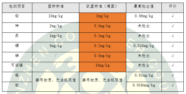 由于配方用料的特殊性,粉底類產(chǎn)品要比普通的面霜和乳液更容易受到重金屬的污染。因此,本次比較試驗不僅檢測國標(biāo)要求的鉛、砷、汞、鎘,歐盟額外要求的銻和可溶鎳,還檢測了我國和歐盟均禁用的鉻和釹,并且,6種有限量要求的重金屬均按照最嚴(yán)格的德國標(biāo)準(zhǔn)進(jìn)行評價。