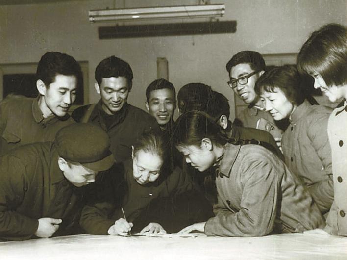 蘇曼華(右二)等人在兒童文學(xué)講習(xí)班學(xué)習(xí)時(shí),圍著冰心先生請(qǐng)她簽名。(攝于1978年12月)