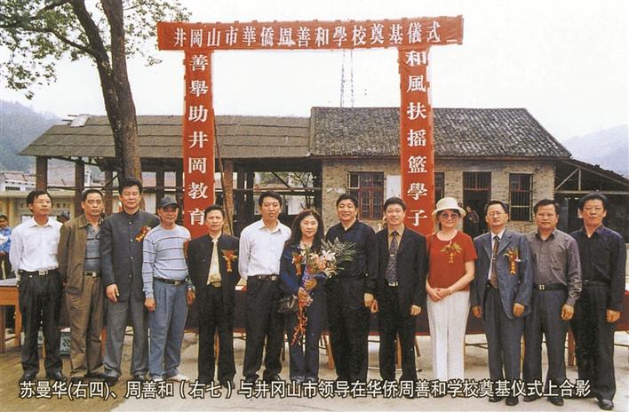 ▲蘇曼華(右四)、周善和(右七)在井岡山市華僑周善和學(xué)校奠基儀式上合影。