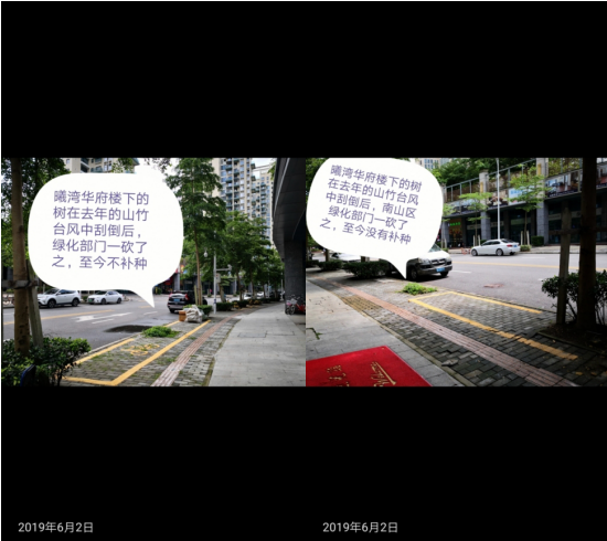“南山區(qū)城管局當(dāng)時(shí)回應(yīng)道:‘因臺風(fēng)砍倒的樹木將會統(tǒng)一采購,盡快予以補(bǔ)種;有問題的路牌將于七月底前更換。會盡快聯(lián)系南山稅務(wù)部門,修復(fù)有問題的井蓋’”,該市民卻對管理部門的工作效率提出質(zhì)疑:“然而現(xiàn)在距離投訴已經(jīng)兩個(gè)月了,問題依然存在。工作效率如此之低?”
