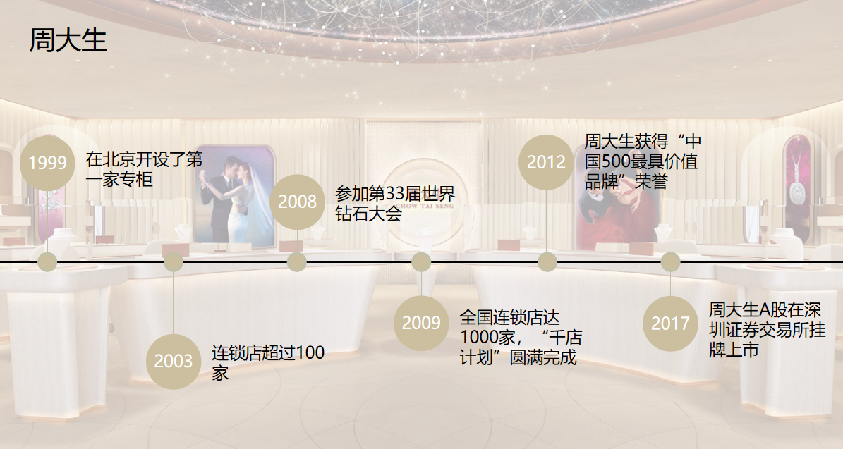 周大生珠寶股份有限公司專注于“周大生”品牌珠寶首飾的設(shè)計生產(chǎn)、品牌運營和連鎖經(jīng)營,是國內(nèi)具有影響力的珠寶品牌運營商之一,也是全國中高端主流市場鉆石珠寶領(lǐng)先品牌。2017年4月27日周大生(股票代碼002867)在深圳證券交易所A股上市。