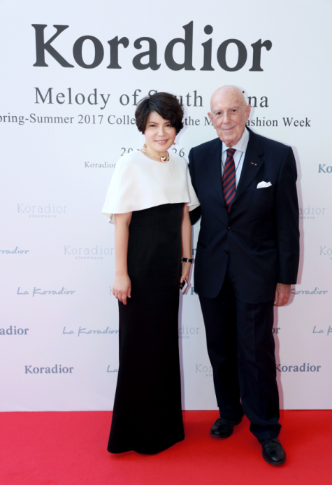 現(xiàn)任贏家時尚控股有限公司董事局主席金明先生和米蘭達可兒在2017年米蘭時裝周Koradior發(fā)布秀背景板合影