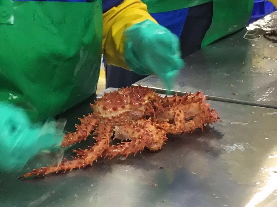 網(wǎng)友在蜘蛛蟹加工基地。湯有國(guó)攝