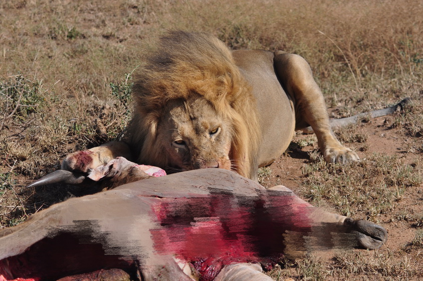 游客們在距雄獅三、五米的車上從容地拍攝了二十多分鐘,記錄下了叢林法則下這場血腥饕餮大餐的全過程。李仁奇 攝