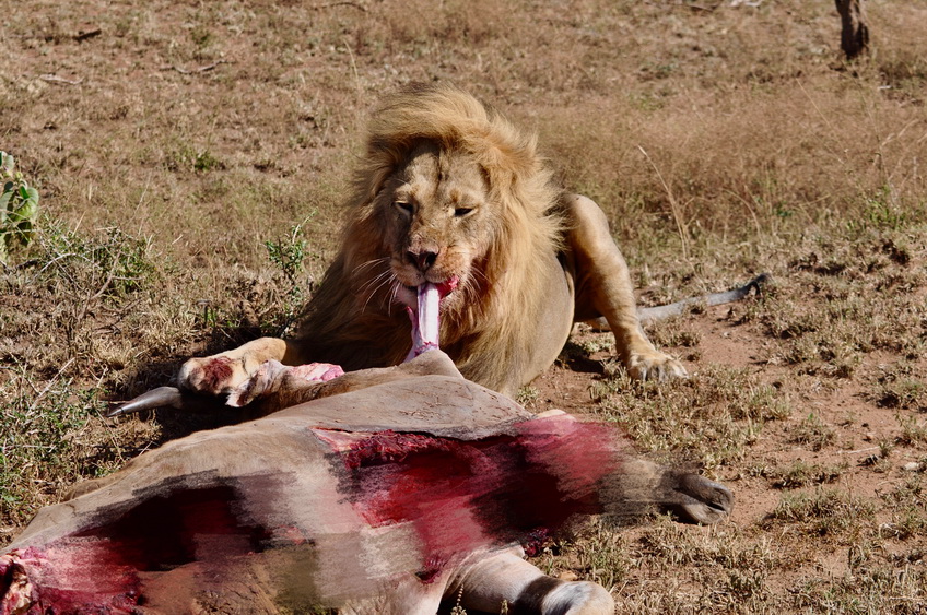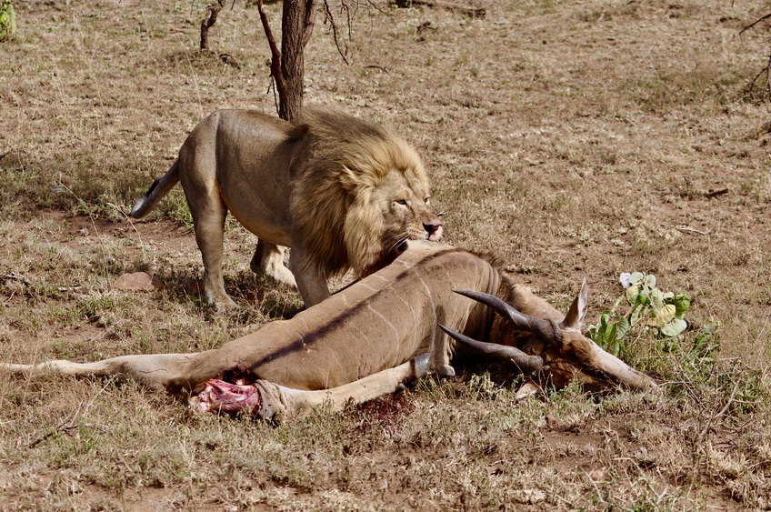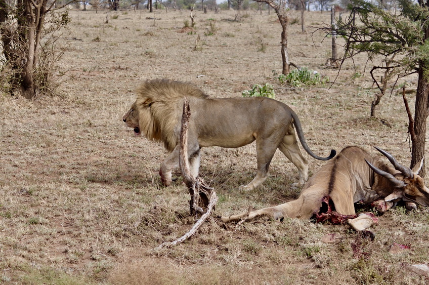 作者運氣不錯,在塞倫蓋蒂巡游時巧遇一頭雄獅守護(hù)在一頭被咬死的大羚羊旁。李仁奇 攝