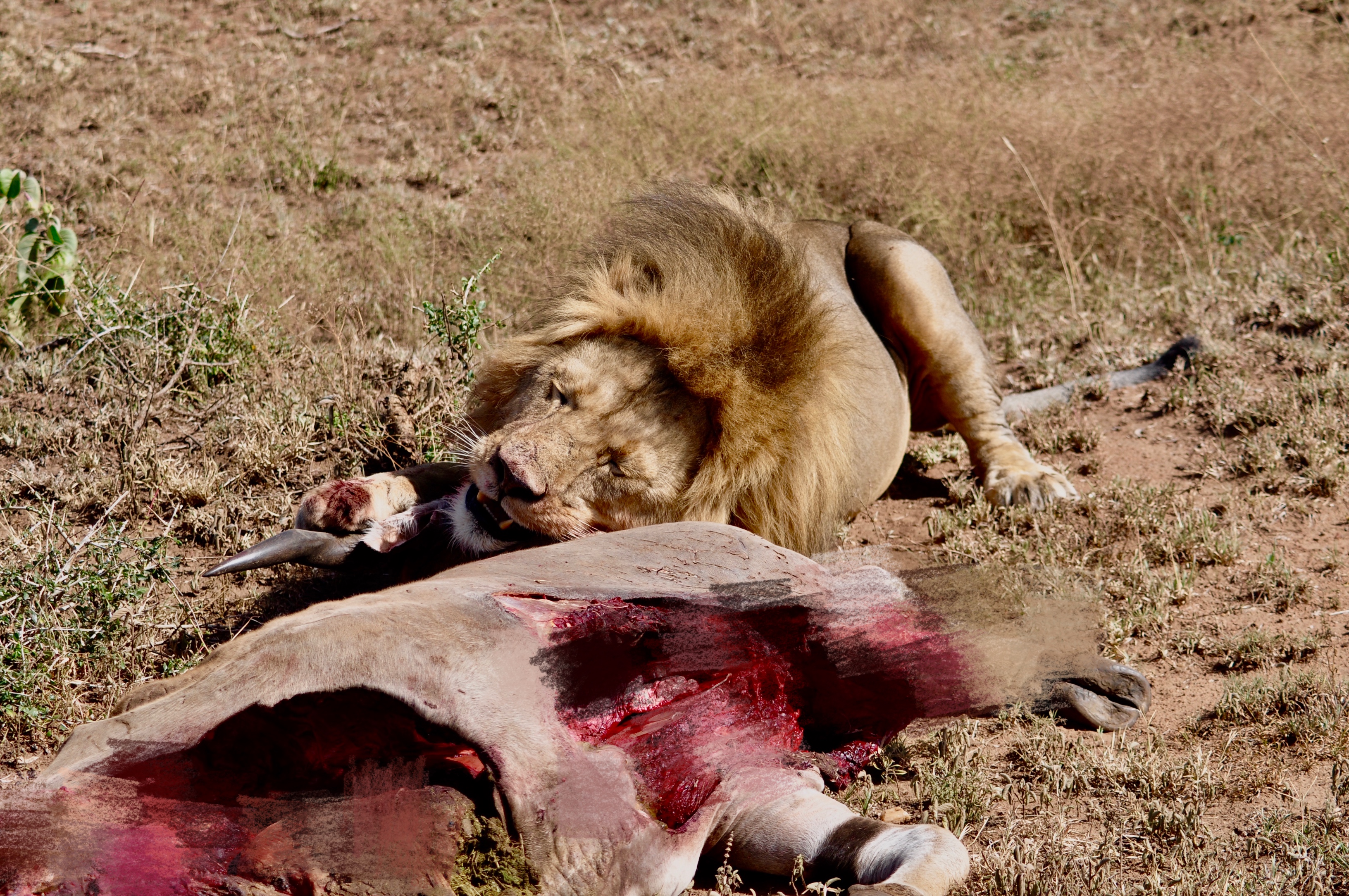 雄獅趴在被咬死的大羚羊旁。李仁奇 攝