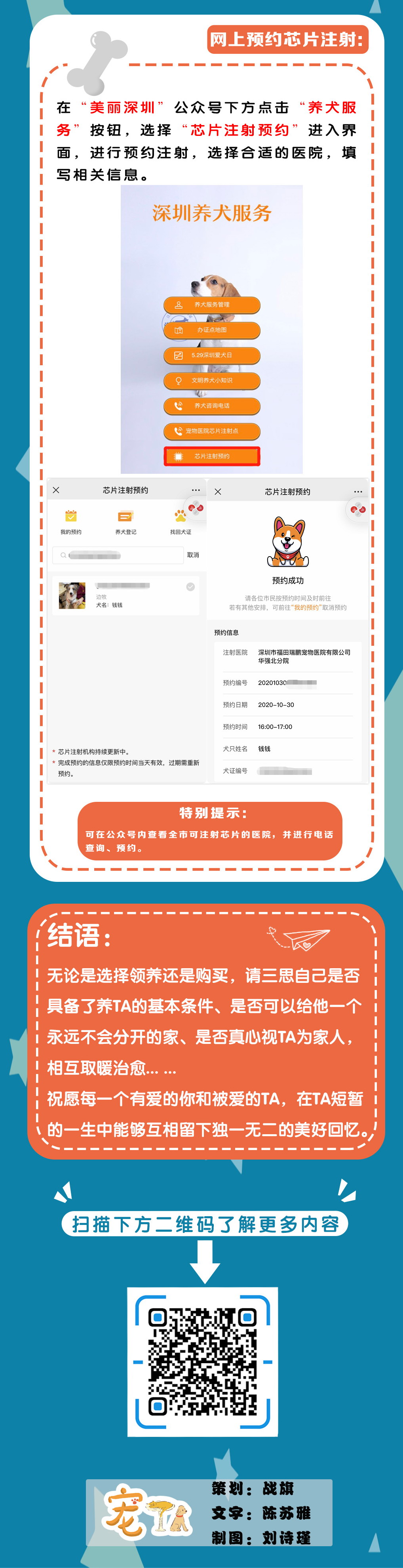 深圳各位毛孩子家長,快來了解下如何辦理線上犬證、如何在網(wǎng)上預(yù)約芯片注射以及在深圳哪些地方可以注射芯片?。ㄗⅲ豪?、幼、病、孕犬雖可以延遲注射或不注射芯片,但仍要辦理養(yǎng)犬證。)