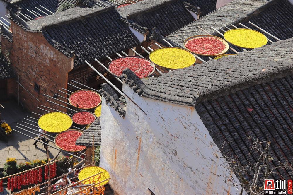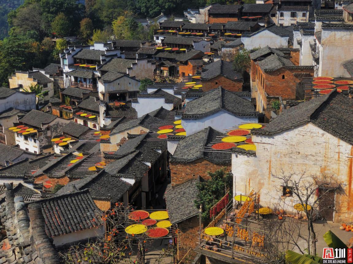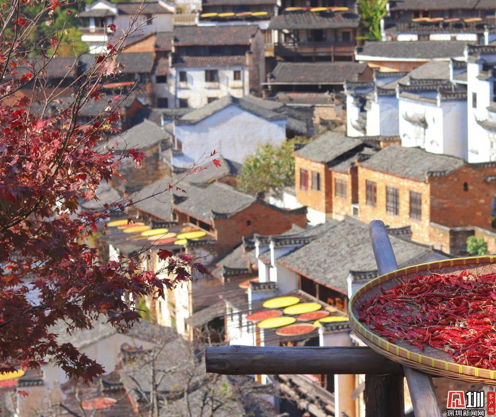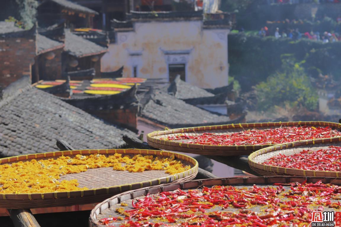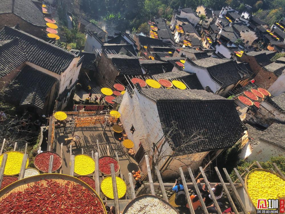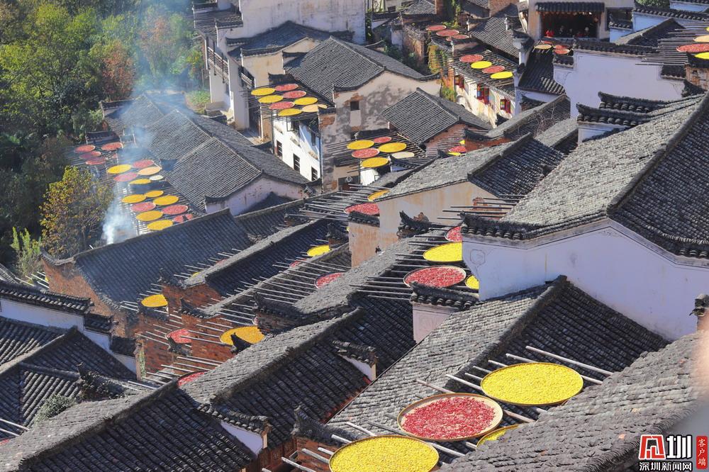 見圳客戶端·深圳新聞網(wǎng)2020年11月25日訊 江西婺源縣篁嶺村獨特的“曬秋”農俗景觀。篁嶺村位于江西省上饒市婺源縣東北部,是著名的“曬秋”文化起源地,也是一座距今近六百年歷史的徽州古村。每當日出山頭,數(shù)百棟徽派古民居在百米落差的坡面錯落排布,整個山間村落徽式民居土磚外墻與曬架上五彩繽紛豐收成果組合,繪就出“曬秋”農俗特色景觀。
