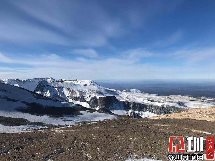 山上積雪覆蓋,與天邊的景色相互交映成一幅美麗的風景畫。
