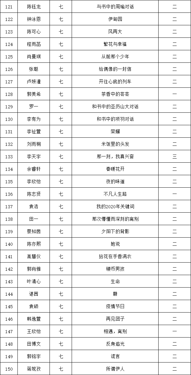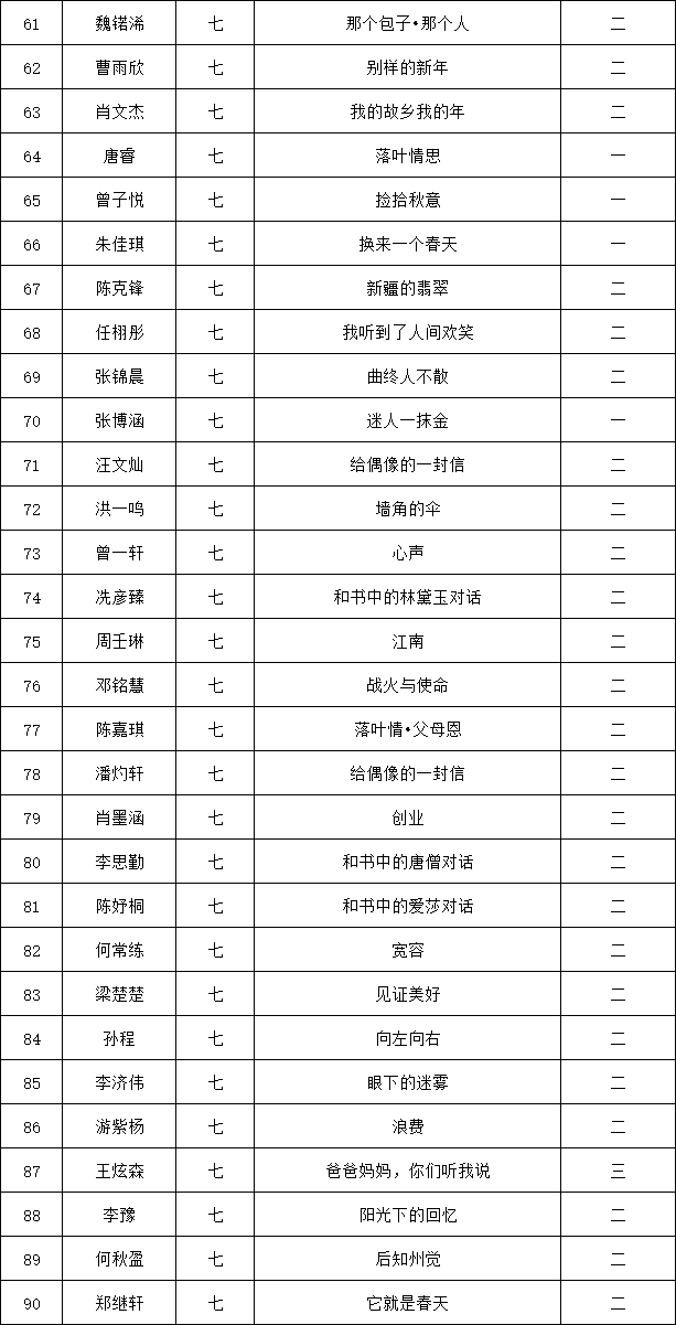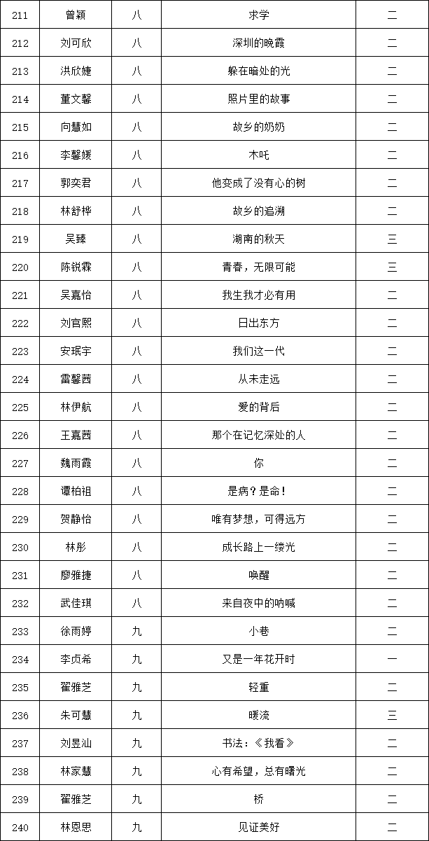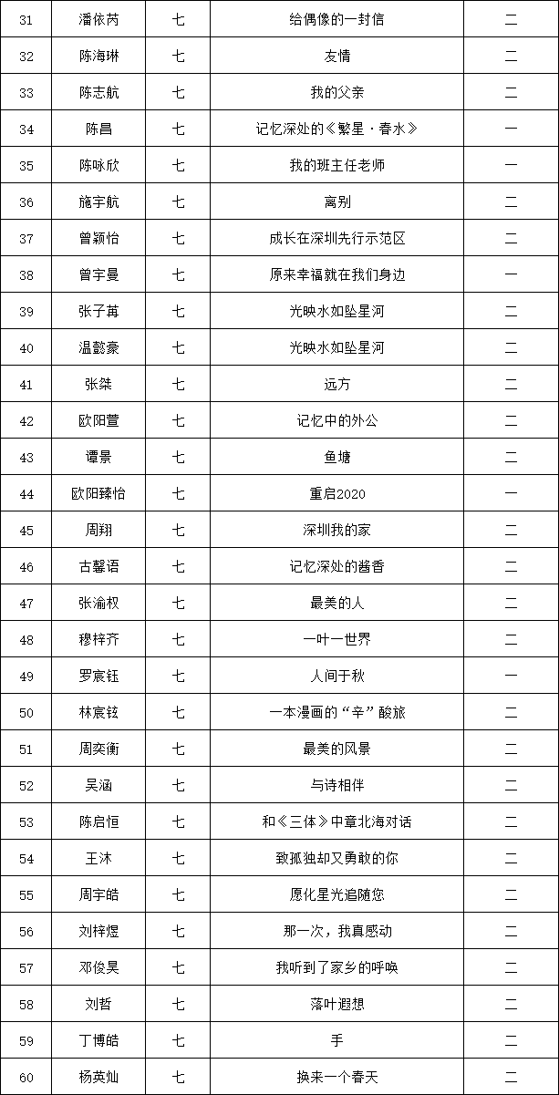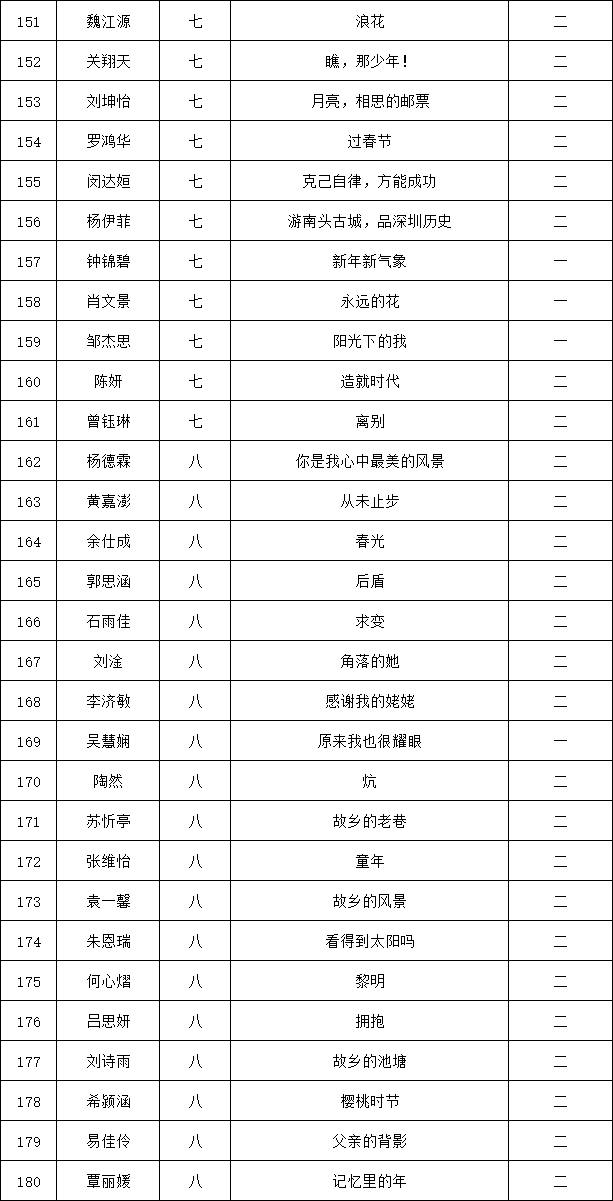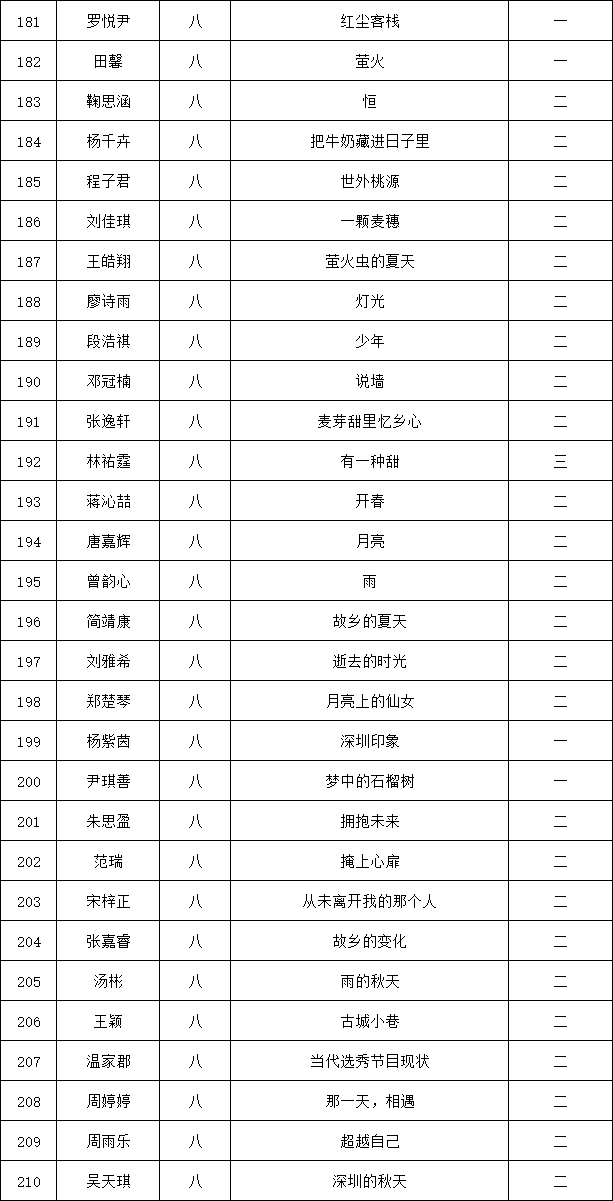 自2021年1月,活動(dòng)征稿啟動(dòng)以來,獲得了深圳市廣大中小學(xué)生、教師、文學(xué)愛好者的熱烈響應(yīng)積極參與,吸引了深圳百余所學(xué)校的上萬人關(guān)注報(bào)名?,F(xiàn)公布龍華區(qū)外國(guó)語學(xué)校專場(chǎng)晉級(jí)復(fù)賽名單如下: