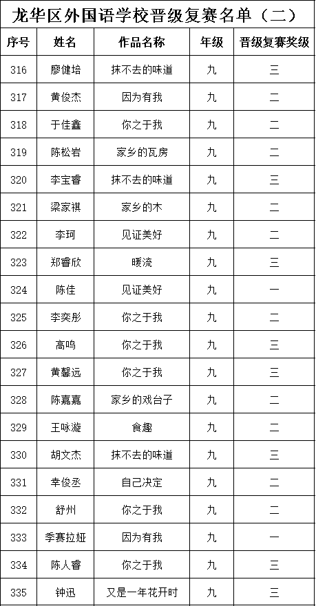 自2021年1月,活動(dòng)征稿啟動(dòng)以來(lái),獲得了深圳市廣大中小學(xué)生、教師、文學(xué)愛(ài)好者的熱烈響應(yīng)積極參與,吸引了深圳百余所學(xué)校的上萬(wàn)人關(guān)注報(bào)名?,F(xiàn)公布龍華區(qū)外國(guó)語(yǔ)學(xué)校專場(chǎng)晉級(jí)復(fù)賽名單如下: