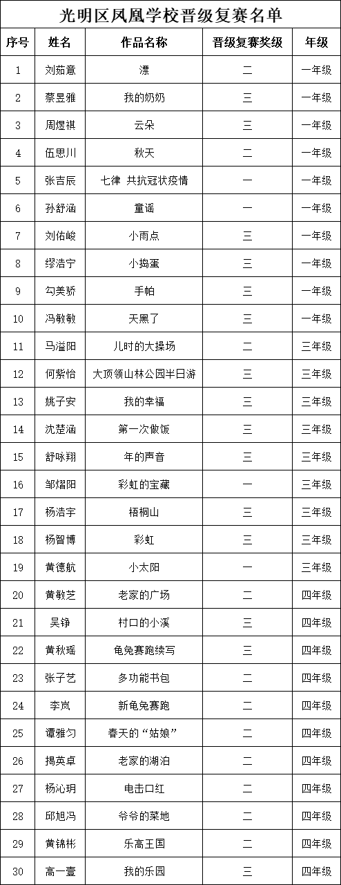 自2021年1月,活動征稿啟動以來,獲得了深圳市廣大中小學(xué)生、教師、文學(xué)愛好者的熱烈響應(yīng)積極參與,吸引了深圳百余所學(xué)校的上萬人關(guān)注報(bào)名。現(xiàn)公布深圳市光明區(qū)鳳凰學(xué)校專場晉級復(fù)賽名單如下: