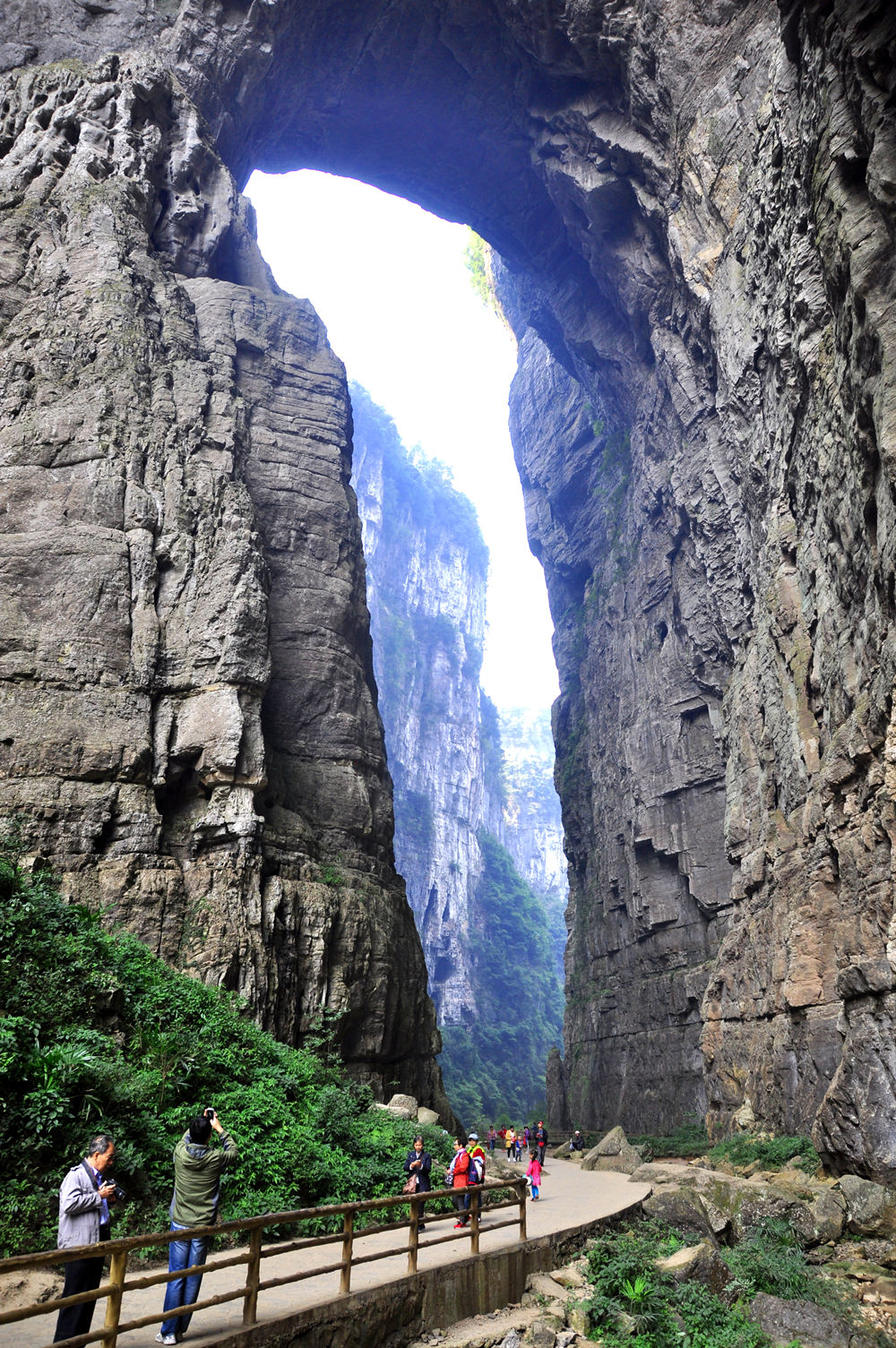 天龍橋?yàn)檠蛩訊{谷上的第一座天生橋,又名頭道橋,高大厚重、磅礴氣勢(shì),以雄壯稱(chēng)奇。橋高235m,橋厚150m,平均拱橋高度96m。拱孔跨度20-75m,平均34m,橋面寬度147m。李仁奇 攝