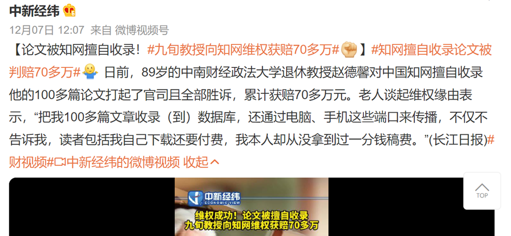 中南財經(jīng)政法大學(xué)退休教授蘇少之,趙德鑫教授的學(xué)生,后來以同樣的方式打官司并勝訴。維權(quán)成功后,蘇少之的論文也被中國知網(wǎng)下架了。有網(wǎng)友點評一針見血:中國知網(wǎng)是不是該把所有教授的賬都結(jié)一下?