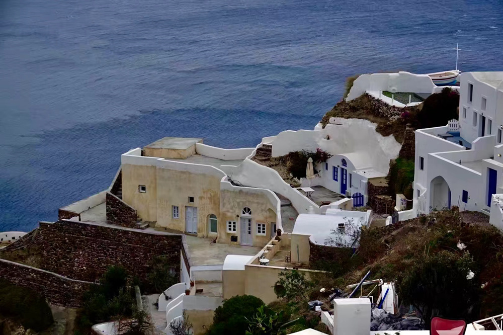 費拉碼頭附近有許多懸崖,無數(shù)的白色小屋依山而建,與天空、海洋混成一體,這是地中海獨有的景觀。李仁奇 攝