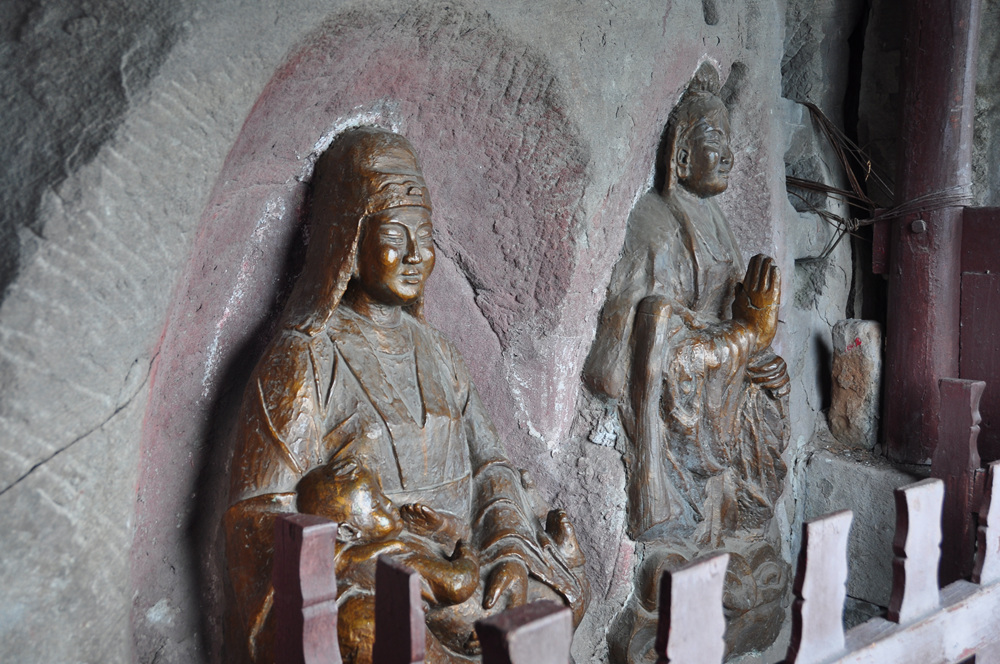 山頂有古剎天子殿,創(chuàng)建于康熙、乾隆年間,是此寨最高點。正殿墻壁有女媧補天故事的壁畫,畫下方,有一遺石,似石寶寨。李仁奇 攝