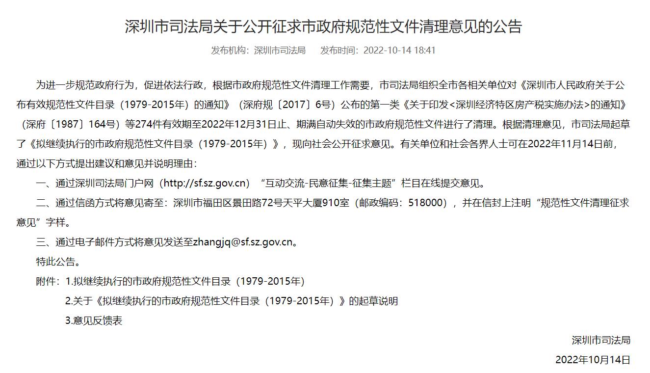 讀特客戶端·深圳新聞網(wǎng)2022年10月20日訊(記者 翁任瑩)近日,深圳市司法局就《擬繼續(xù)執(zhí)行的市政府規(guī)范性文件目錄(1979-2015年)》向社會公開征求意見,擬對274件有效期至2022年12月31日止、期滿自動失效的市政府規(guī)范性文件進(jìn)行清理。