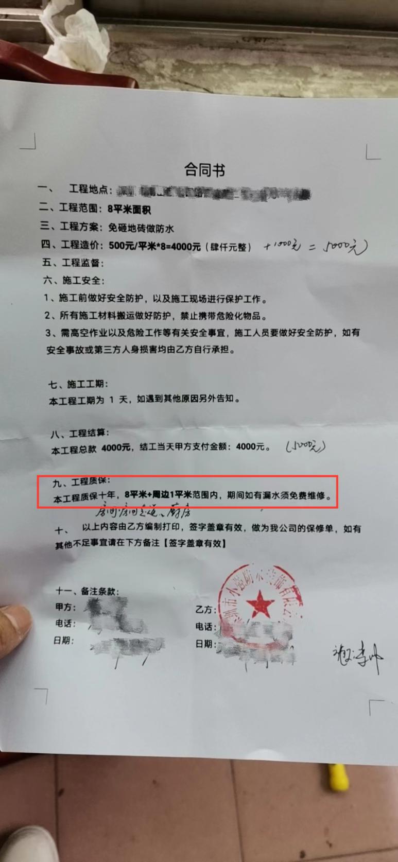 本人于2022年3月29日與該商家簽訂施工合同,支付4000元做防水工程并于當(dāng)天施工,到了雨季發(fā)現(xiàn)施工處依然漏水,聯(lián)系商家上門維修了1次,但之后發(fā)現(xiàn)施工處仍然漏水,多次聯(lián)系商家無回復(fù)。合同中約定工程質(zhì)保10年,現(xiàn)要求商家按照合同約定免費提供維修服務(wù)。