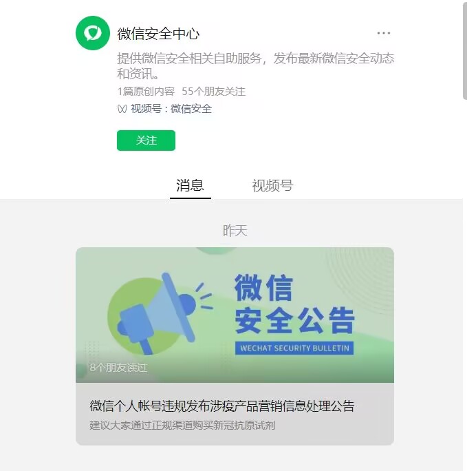 公告強調,“利用微信個人帳號發(fā)布抗原檢測試劑、藥品等營銷信息的行為,違反了相關法律法規(guī),也違反了《微信個人帳號使用規(guī)范》,微信安全團隊將對違法違規(guī)行為進行堅決處理、嚴厲打擊。”