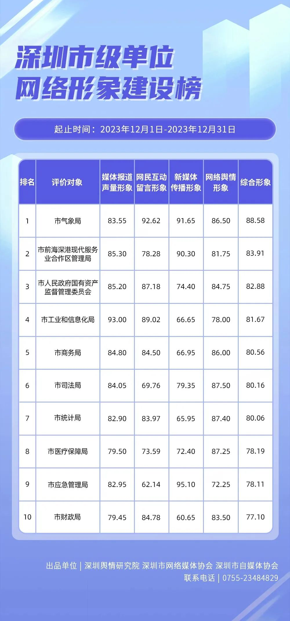 深圳新聞網(wǎng)2月1日訊(記者 陳曉君 實(shí)習(xí)生 陳佳鈴)2024年1月31日,“深圳各區(qū)各單位網(wǎng)絡(luò)形象建設(shè)榜”(2023年12月期)正式發(fā)布,榜單以報道留言聲量、社會生活評價、宣傳策劃質(zhì)效以及輿情化解能力等為指標(biāo),全面考量深圳各區(qū)(含大鵬新區(qū)、深汕特別合作區(qū))、市級單位(市政府工作部門、市管單位)的網(wǎng)絡(luò)形象建設(shè)成效,最終形成《深圳各區(qū)網(wǎng)絡(luò)形象建設(shè)榜》和《深圳市級單位網(wǎng)絡(luò)形象建設(shè)榜》。