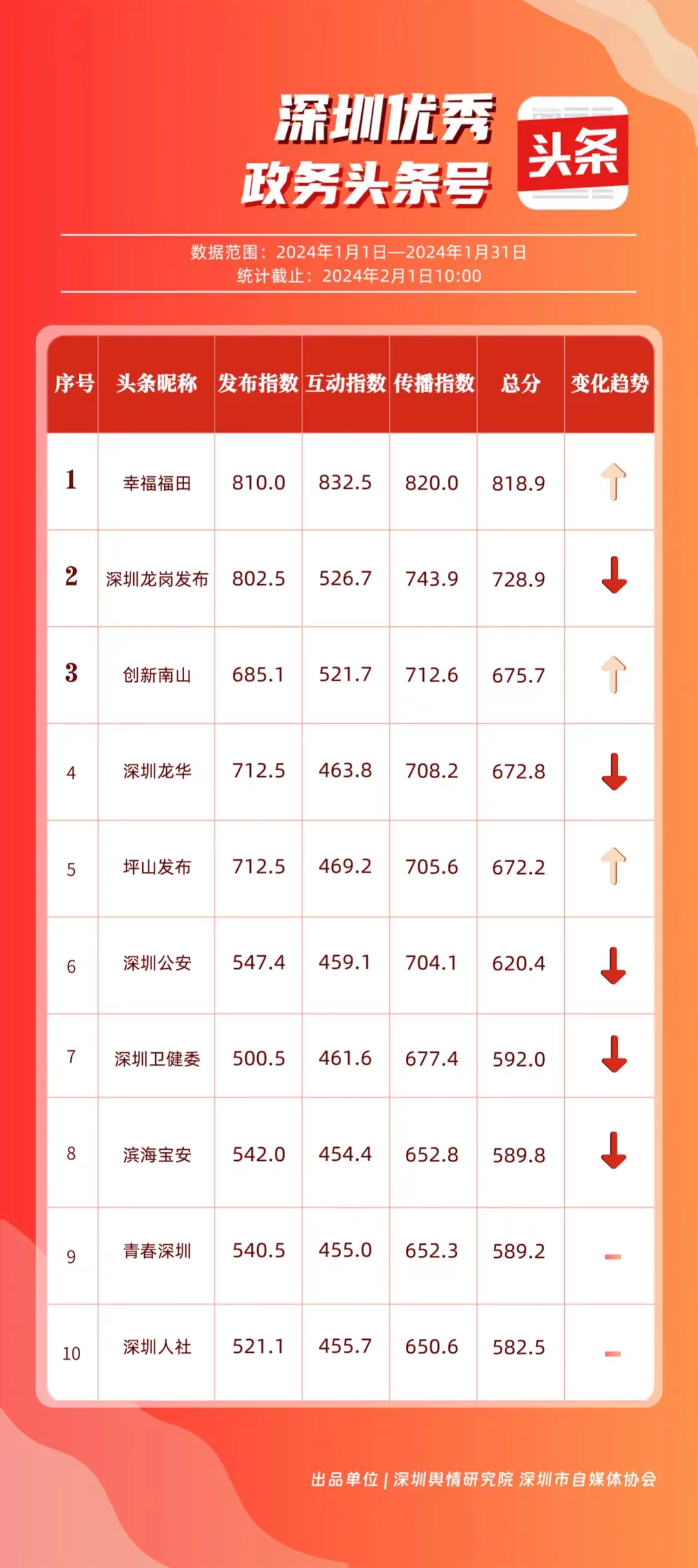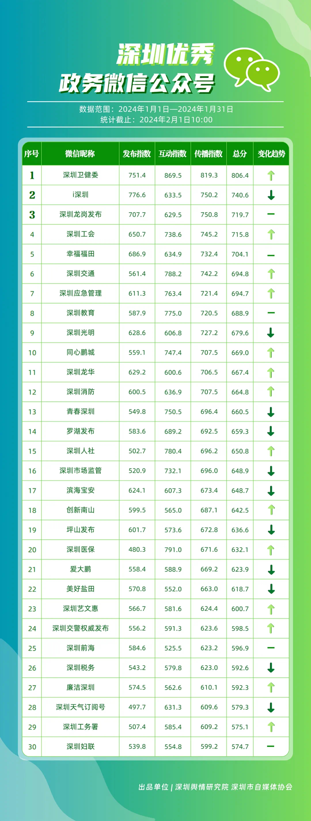 深圳新聞網(wǎng)2月9日訊(記者 陳曉君 實(shí)習(xí)生 張馳)2月8日,深圳輿情研究院、深圳市自媒體協(xié)會(huì)聯(lián)合推出《深圳優(yōu)秀政務(wù)新媒體矩陣》(2024年1月期),市衛(wèi)生健康委、市氣象局、福田區(qū)、光明區(qū)、龍崗區(qū)、龍華區(qū)、市公安局、市應(yīng)急管理局、市交通警察局、羅湖區(qū)的新媒體矩陣獲評“深圳優(yōu)秀政務(wù)新媒體矩陣”。這些矩陣在內(nèi)容發(fā)布、受眾互動(dòng)和信息傳播方面取得了較好成績,并在深圳政務(wù)新媒體規(guī)范有序發(fā)展進(jìn)程中發(fā)揮著積極作用。