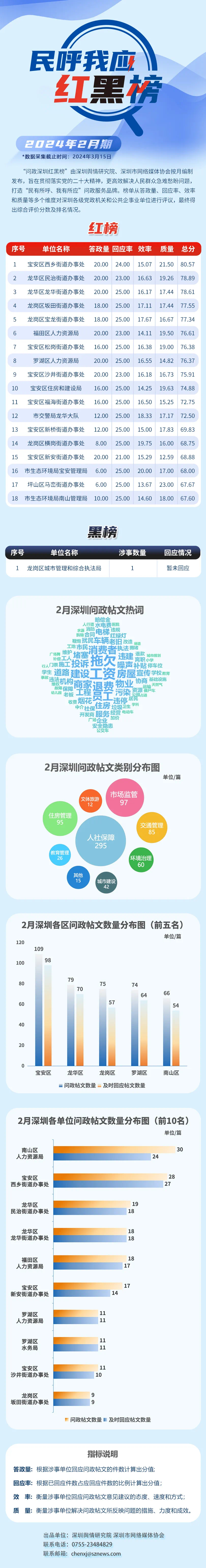 本期榜單采集的帖文主要來自深圳論壇、深圳各區(qū)政府官網(wǎng)、人民網(wǎng)領(lǐng)導(dǎo)留言板及深圳新聞網(wǎng)“民呼我應(yīng)”等平臺,所采集帖文發(fā)布時間為2024年2月1日至2月29日,采集截止時間為2024年3月15日。榜單具有科學(xué)、合理、完備的綜合評價體系,能夠從答政量、回應(yīng)率、效率和質(zhì)量等多個維度對深圳各級黨政機(jī)關(guān)和公共企事業(yè)單位進(jìn)行評議。