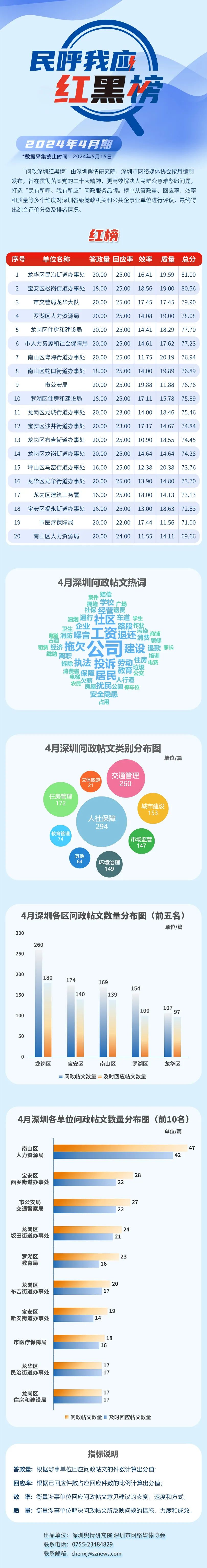 本期榜單采集的帖文主要來自深圳市及各區(qū)政府官網(wǎng)、深圳論壇、人民網(wǎng)領(lǐng)導(dǎo)留言板、深圳新聞網(wǎng)“民呼我應(yīng)”等平臺(tái),所采集帖文發(fā)布時(shí)間為2024年4月1日至4月30日,采集截止時(shí)間為2024年5月15日。