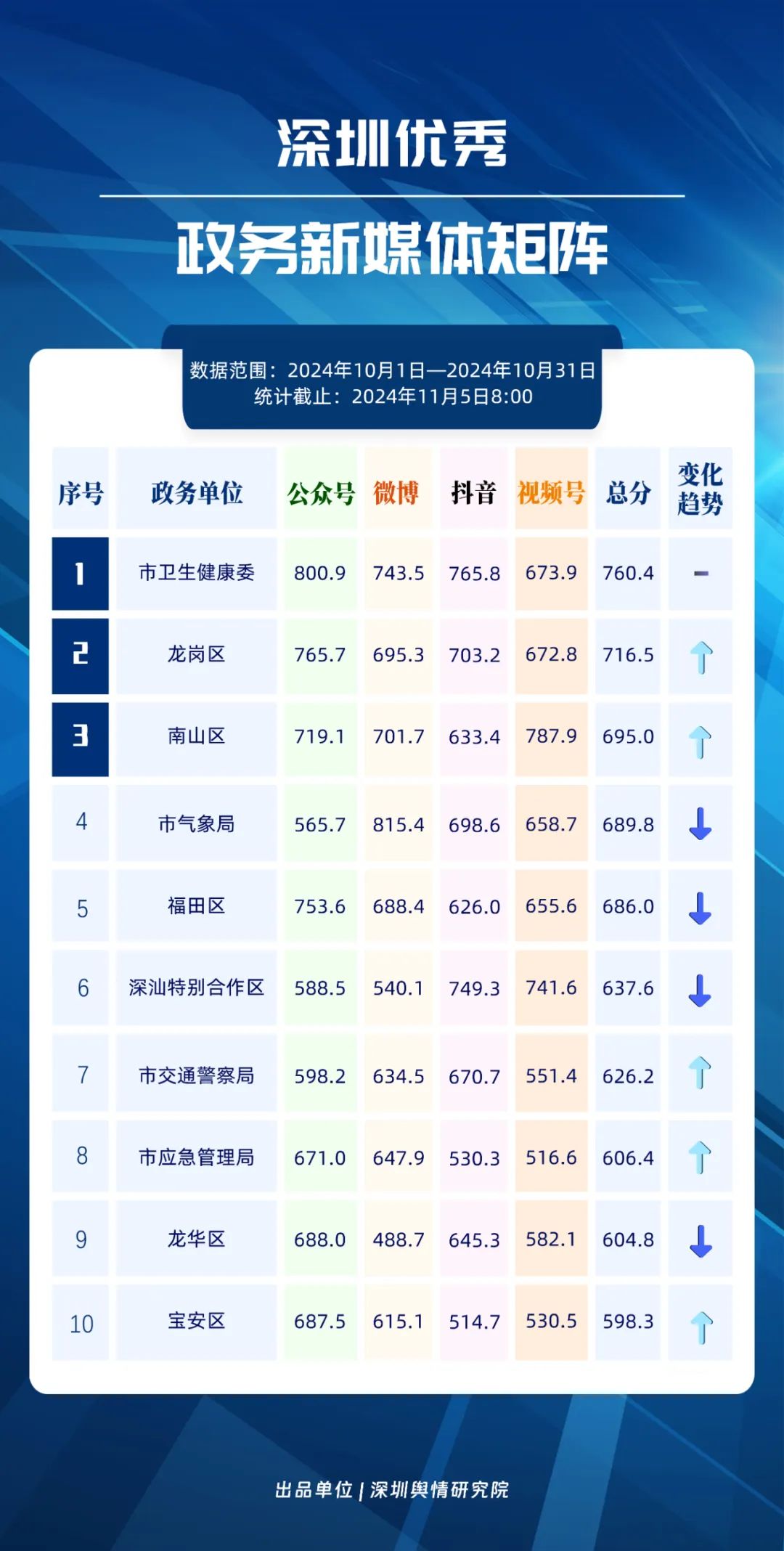 《深圳優(yōu)秀政務(wù)新媒體矩陣》2024年10月榜單揭曉,讓我們一同關(guān)注,哪些新媒體矩陣能夠憑借優(yōu)異表現(xiàn)嶄露新姿,成為加速政務(wù)傳播與服務(wù)創(chuàng)新發(fā)展的先鋒。