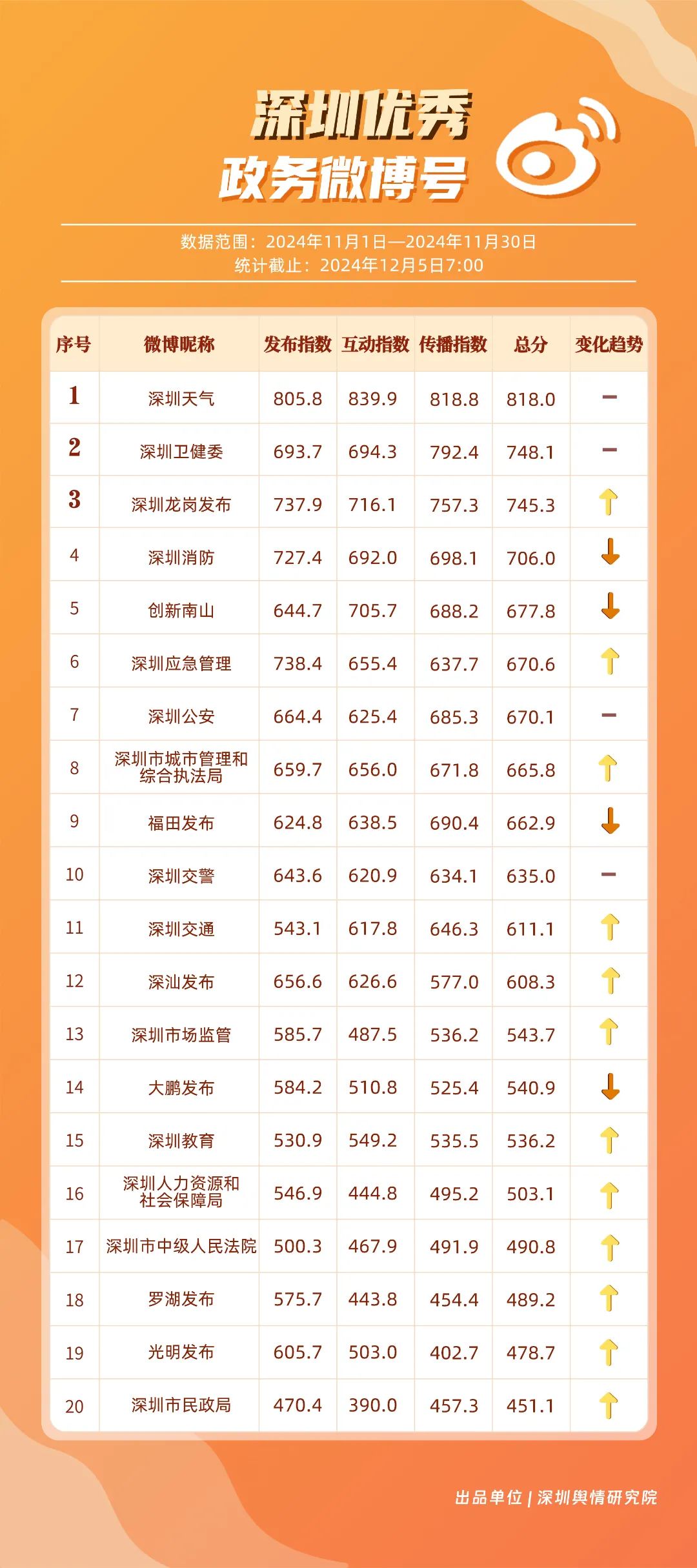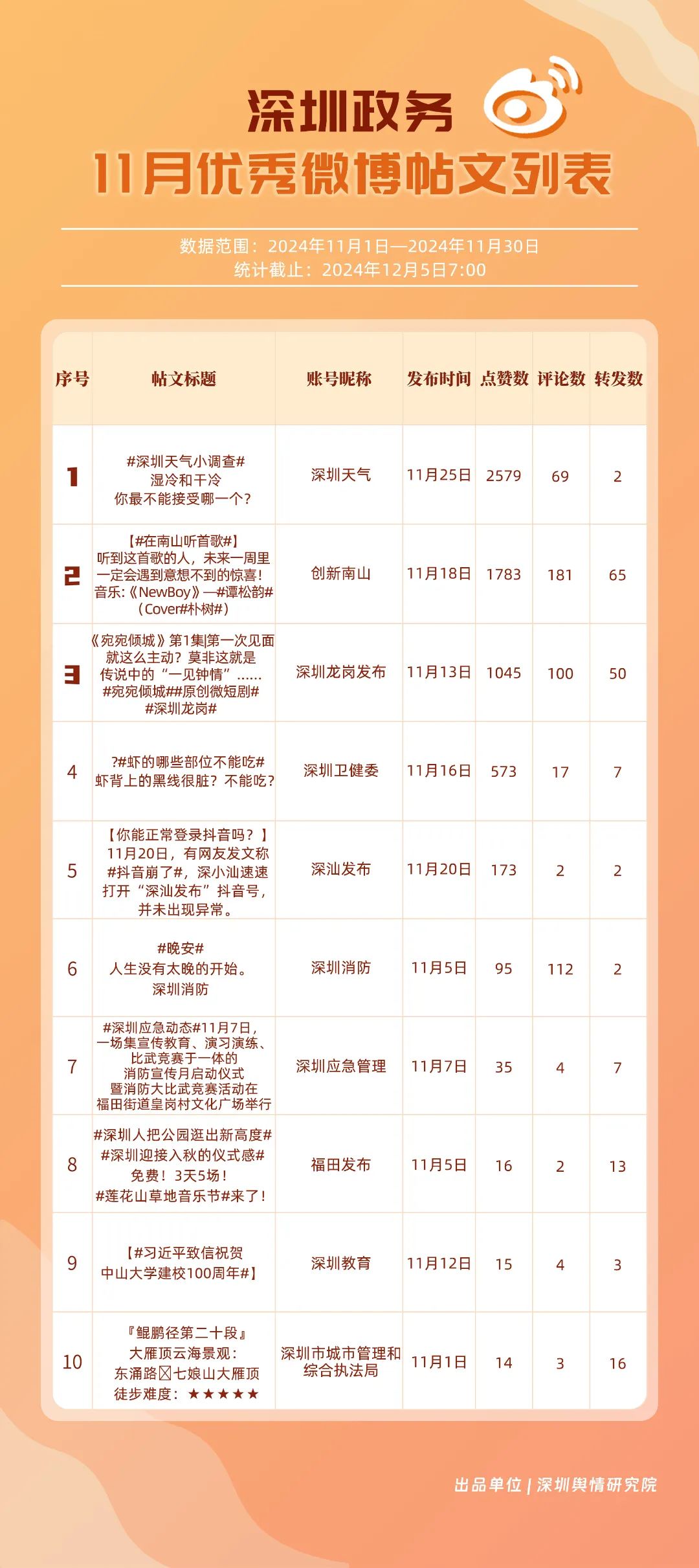 11月,“深圳天氣”“深圳衛(wèi)健委”“深圳龍崗發(fā)布”“深圳消防”“創(chuàng)新南山”“深圳應急管理”“深圳公安”“深圳市城市管理和綜合執(zhí)法局”“福田發(fā)布”“深圳交警”等20個賬號入選“優(yōu)秀政務微博號”。“深圳天氣”“深圳衛(wèi)健委”賬號在信息傳播上不斷精進,為市民帶來及時、優(yōu)質(zhì)且高效的資訊,內(nèi)容緊貼民生,贏得了市民的廣泛贊譽,排名穩(wěn)定在前2名。同時,“深圳龍崗發(fā)布”“深圳消防”和“創(chuàng)新南山”等賬號也能夠精準滿足市民的信息需求,并在此基礎上提升市民閱讀體驗,推動了其在榜單上的穩(wěn)步提升,彰顯了政務微博的創(chuàng)新活力與社會價值。