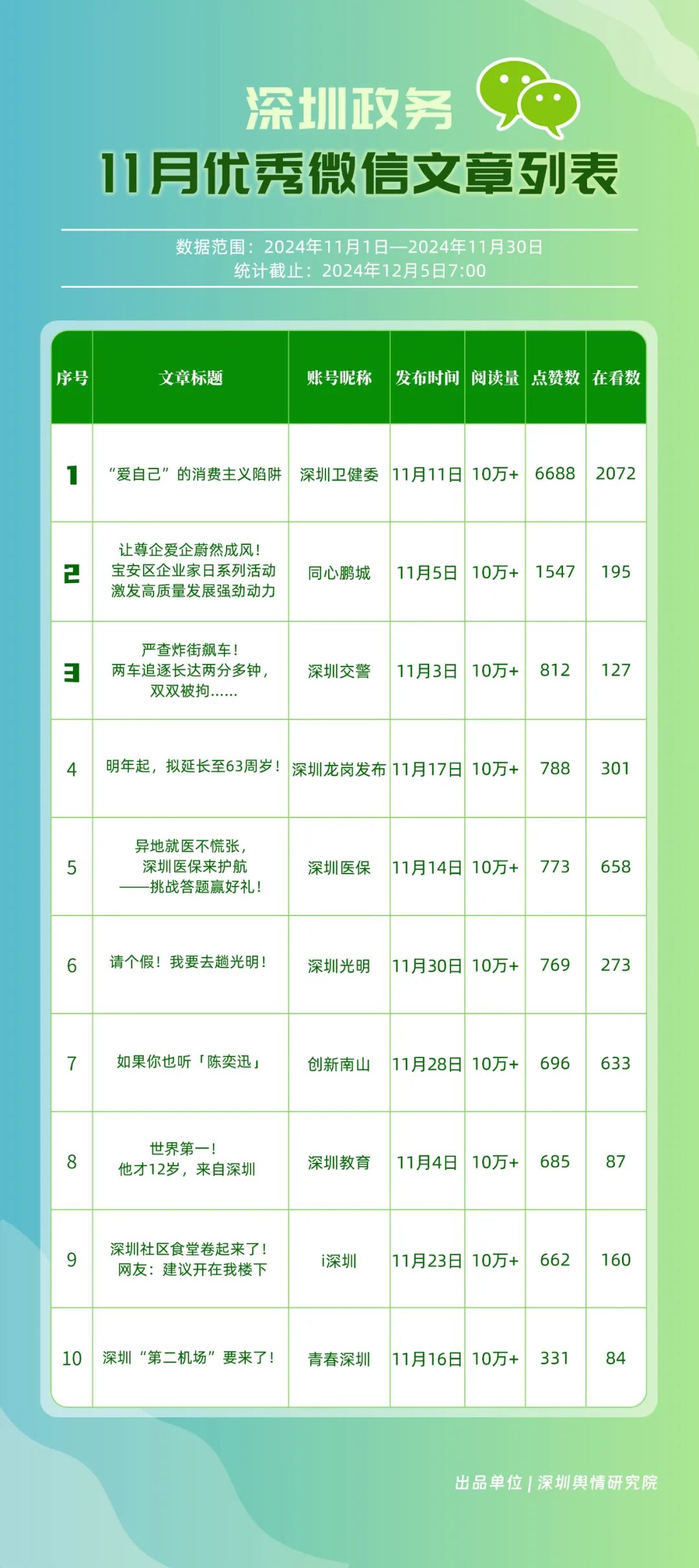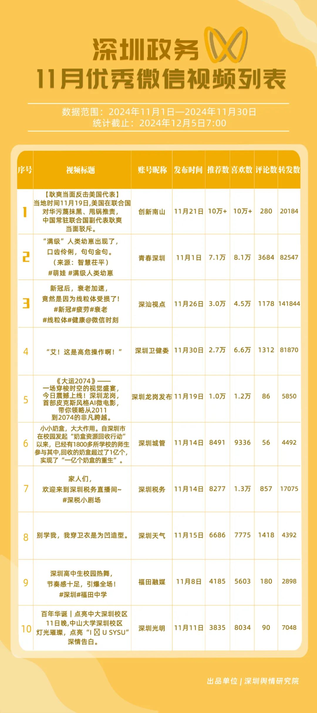 11月,獲“深圳優(yōu)秀政務微信視頻號”稱號的分別是“深汕視點”“青春深圳”“深圳衛(wèi)健委”“創(chuàng)新南山”“深圳龍崗發(fā)布”“福田融媒”“深圳教育”“深圳天氣”“深圳稅務”“深圳光明”。其中,“深汕視點”與“青春深圳”通過積極轉(zhuǎn)發(fā)涵蓋廣泛領域的優(yōu)質(zhì)視頻內(nèi)容,贏得了網(wǎng)民的廣泛點贊與推薦,彰顯了其在內(nèi)容聚合與傳播上的獨到之處?!吧钲谛l(wèi)健委”則專注于衛(wèi)生健康領域,發(fā)布了一系列高質(zhì)量的內(nèi)容,深受網(wǎng)民喜愛,進一步鞏固了其在健康傳播領域的領先地位。